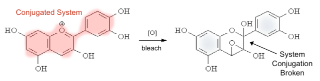 Intense bleaching whitens clothes because it shifts light absorption all the way to the ultraviolet. One possible reaction of cyanidin with bleach is shown below..