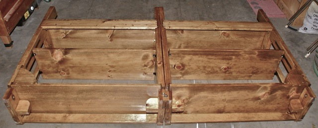 Shown below are pictures of how the two 3-ft Bookshelves were united to make a 6-ft Unit. This was accomplished simply using two bolts and nuts. Once together there was a blank space between the shelving units that was filled for aesthetics using small blocks of leftover 1′ panel. Those small, front blocks were locked in place with nails as pins and small holes in the shelf ends. Again this was done for child safety. It didn’t take a lot of extra work and looked much prettier.