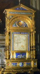 Sometime later a new crystal tube was designed for the relic. At either end are rings of gold and copper, with a cross surmounting the top. The tube, with the cloth clearly visible, is sealed and kept within a special ostensorium. This is adorned at its base with four enamel panels which depict events in the history of the relic.