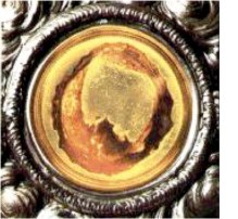 Thus the wine that was changed into live Blood later coagulated into five globules, irregular and differing in shape and size. The Host-Flesh can be very distinctly observed today, and has the same dimensions as the large host used in the Latin church. It is light brown in color and appears rose-colored when lit from the back. The coagulated Blood and has an earthy color resembling the yellow of ochre.